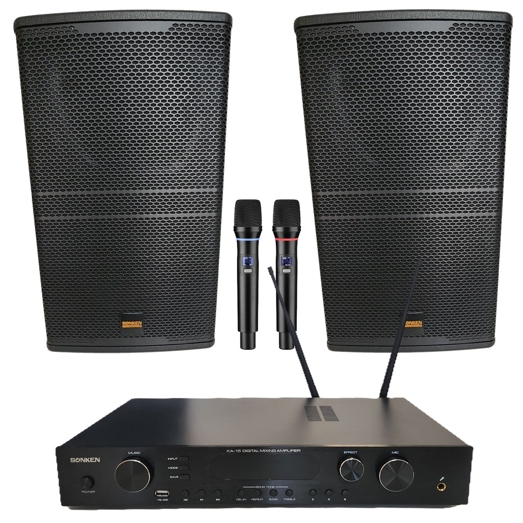 Karaoke Home Entertainment presents our Professional Home Karaoke Studio System which includes the Sonken KA-15 Karaoke Mixing Amplifier with the Sonken MSR-1210 Passive 12" Premium Speakers complete with 2 UHF Wireless Microphones.
