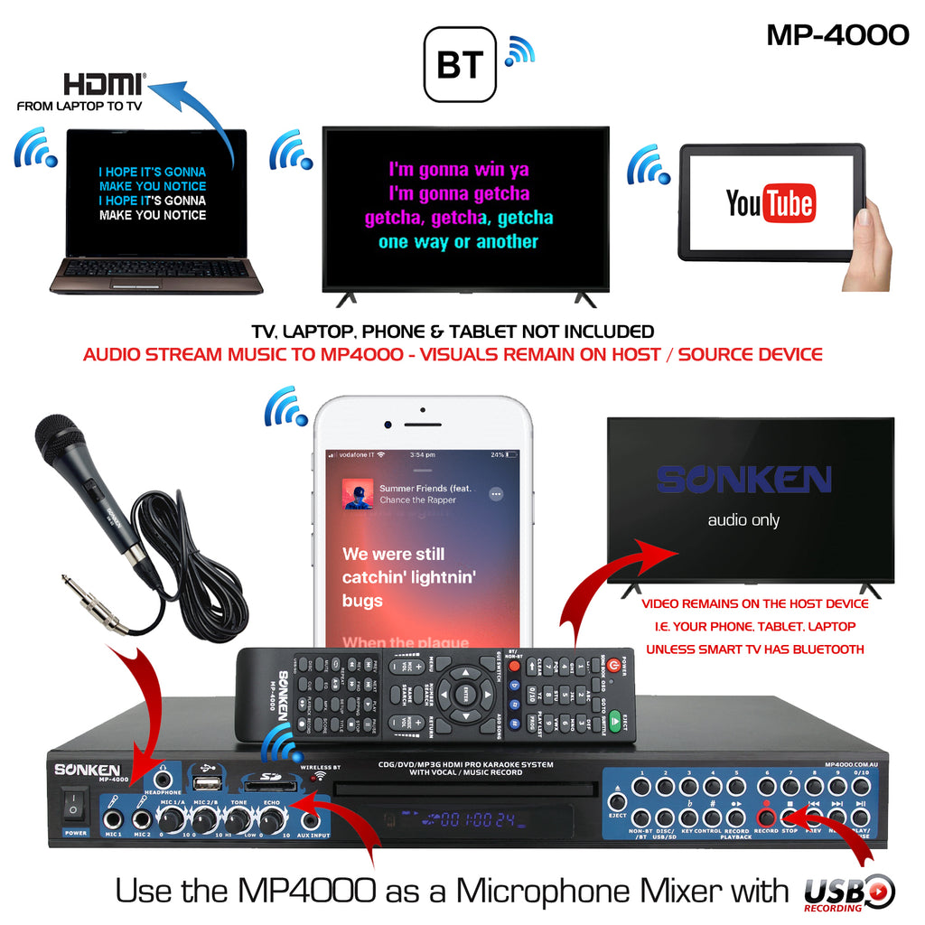 The MP4000 features like Vocal Record to USB (From CD+G or MP3+G), HDMI connectivity, Song Book Creator Feature so you can create a song book of all your MP3+G songs located on the USB Memory Stick with a push of a button, print it out on your PC and then you can play your songs back by simply entering in the unique song number for every song, 4x Microphone Inputs (2x Front 2x Rear) and plays all the popular karaoke formats CD+G, DVD, VCD and Digital Downloads in the format of MP3+G all with on-screen lyrics and music.