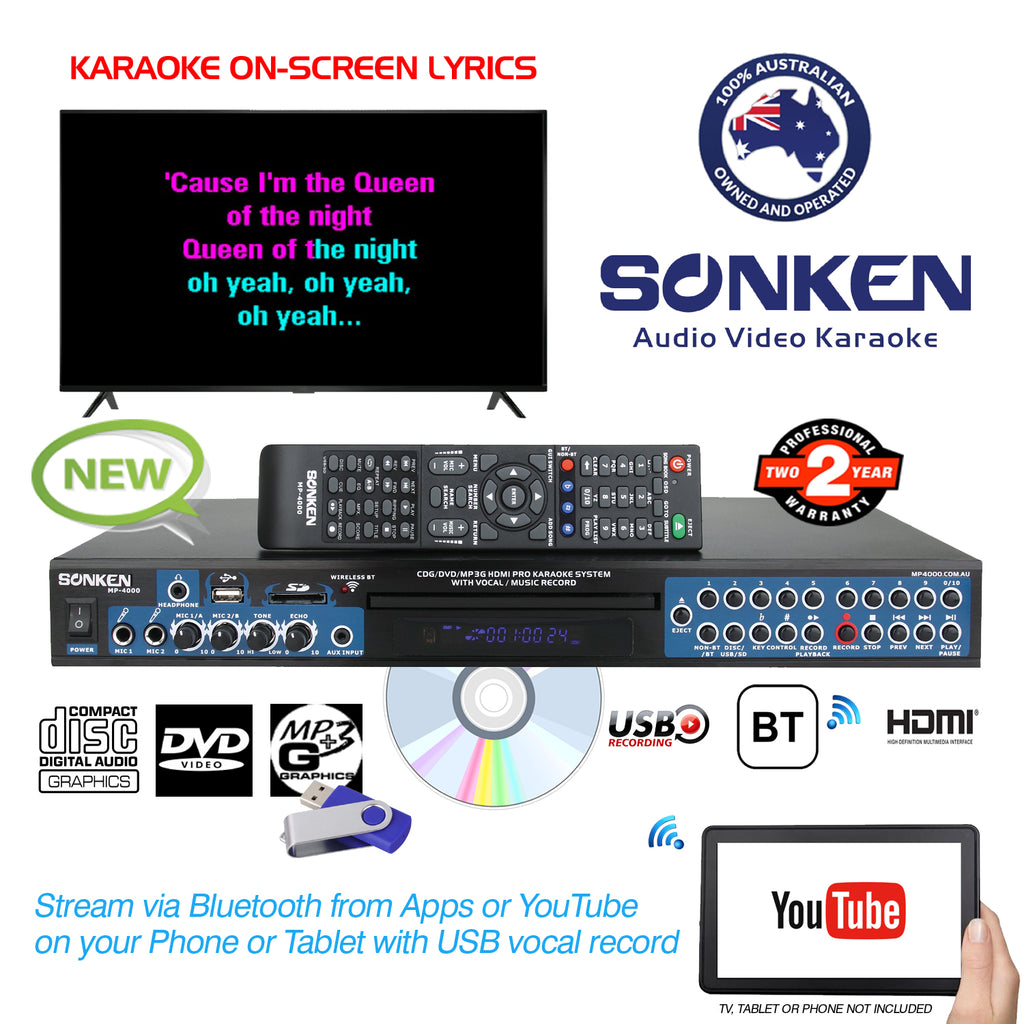 Professional Series Sonken MP4000 Karaoke Machine with features like Vocal Record to USB (From CD+G or MP3+G), HDMI connectivity, Song Book Creator Feature so you can create a song book of all your MP3+G songs located on the USB Memory Stick with a push of a button, print it out on your PC and then you can play your songs back by simply entering in the unique song number for every song, 4x Microphone Inputs (2x Front 2x Rear) and plays all the popular karaoke formats CD+G, DVD, VCD and Digital Downloads in the format of MP3+G all with on-screen lyrics and music.